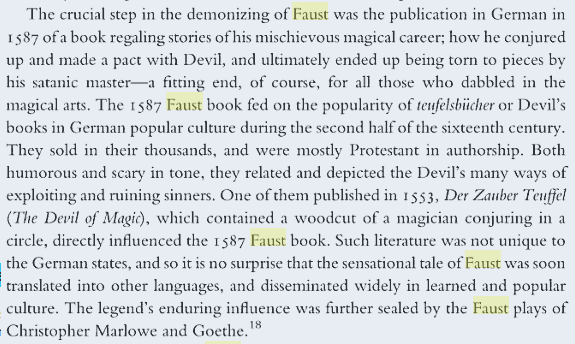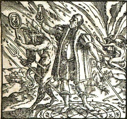 [The early formation of the developing Faust legend into the original Faust book or Faustbuch from Owen Davies’ Grimoires: a history of magic books. Below – the influential woodcut from the 1553 book The Devil of Magic (Der Zauber Teuffel).]