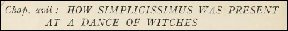Simplicissimus and the Witches’ Dance.Hans Jakob Christoffel von Grimmelshausen (1621 – August 17, 1676) wrote a very popular “picaresque” novel Simplicius Simplicissimus in 1669. A picaresque is a story following the adventures of a low caste heroic rogue or trickster who uses his wits to survive precarious times among a corrupt society.Following is an excerpt in which Simplicissimus stumbles upon a witches’ dance while robbing a farmer’s larder:Chap. xvii.: HOW SIMPLICISSIMUS WAS PRESENT AT A DANCE OF WITCHESDuring these my wanderings there met me once and again in the woods different country-folk, who at all times fled from me. I know not if the cause was that they were by reason of the war turned so timid and were so hunted, and never left in peace in one place, or whether the highwaymen had spread abroad in the land the adventure they had had with me, so that all which saw me thereafter believed the evil one was of a truth prowling about in that part. But for this reason I must needs fear lest my provisions should fail and so I be brought to the uttermost misery; for then must I begin again to eat roots and herbs, to which I was no longer accustomed. As I pondered on this I heard two men cutting of wood, which rejoiced me mightily. So I followed the sound of the blows, and when I came in sight of the men I took a handful of ducats out of my pouch and, creeping nearer to them, shewed them the alluring gold and cried, “My masters, if ye will but wait for me I will give you this handful of gold.” But as soon as they saw me and my gold, at once they took to their heels, and left their mallets and wedges together with their bag of bread and cheese; with this I filled my knapsack, and so betook myself back to the wood, doubting if in my life I should ever come to the company of men again. So after long pondering thereupon, I thought, “Who knoweth what may chance to thee? Thou hast money, and if thou comest in safety with it to honest folk, thou canst live on it a long while.” So it came into my head to sew it up; and to that end I made, out of my asses’ ears which made the folk so fly from me, two armlets, and companying my Hanau ducats with those of the banditti, I packed all together into these armlets and bound them on mine arms above the elbow. And now, as I had thus secured my treasure, I attacked the farms again, and got from them what I needed and what I could snap up. And though I was but simple, yet I was sly enough never to come a second time to a place where I had stolen anything; and therefore was I very lucky in my thefts and was never caught pilfering.It fell out at the end of May, as I sought to replenish my store by my customary yet forbidden tricks, and to that end had crept into a farmyard, that I found my way into the kitchen, but soon perceived that there were people still awake (and here note that where dogs were I wisely stayed away); so I set the kitchen door, which opened into the yard, ajar, that if any danger threatened I could at once escape, and stayed still as a mouse till I might expect the people would go to bed. But meanwhile I took note of a crack that was in the kitchen-hatch that led to the living-room; thither I crept to see if the folk would not soon go to rest; but my hopes were deceived, for they had but now put on their clothes, and in place of a light there stood a sulphurous blue flame on a bench, by the light of which they anointed sticks, brooms, pitchforks, chairs, and benches, and on these flew out of the window one after another. At this I was horribly amazed, and felt great terror; yet, as being accustomed to greater horrors, and, moreover, in my whole life having never heard nor read of witches, I thought not much of this, and that chiefly because ’twas all so done in such stillness; but when all were gone I betook myself also to the living-room, and devising what I could take with me and where to find it, in such meditation sat me down straddle-wise upon a bench; whereon I had hardly sat down when I and the bench together flew straight out of the window, and left my gun and knapsack, which I had laid aside, as pay for that magical ointment. Now my sitting down, my departure, and my descent were all in one moment, for I came, methought, in a trice to a great crowd of people; but it may be that from fear I took no count how long I took for this long journey. These folk were dancing of a wondrous dance, the like of which I saw never in my life, for they had taken hands and formed many rings within one another, with their backs turned to each other like the pictures of the Three Graces, so that all faced outwards. The inmost ring was of some seven or eight persons; the second of as many again: the third contained more than the first two put together, and so on, so that in the outermost ring there were over two hundred persons; and because one ring danced towards the right and the next towards the left, I could not see how many rings they formed, nor what was in the midst around which they danced. Yet all looked monstrous strange, because all the heads wound in and out so comically. My bench that brought me alighted beside the minstrels which stood outside the rings all round the dancers, of which minstrels some had, instead of flutes, clarinets and shawms, nothing but adders, vipers and blind-worms, on which they blew right merrily: some had cats into whose breech they blew and fingered on the tail; which sounded like to bagpiper: others fiddled on horses’ skulls as on the finest violins, and others played the harp upon a cow’s skeleton such as lie in the slaughter-house yards: one was there, too, that had a bitch under his arm, on whose tail he fiddled and fingered on the teats; and throughout all the devils trumpeted with their noses till the whole wood resounded therewith: and when the dance was at an end, that whole hellish crew began to rave, to scream, to rage, to howl, to rant, to ramp, and to roar as they we